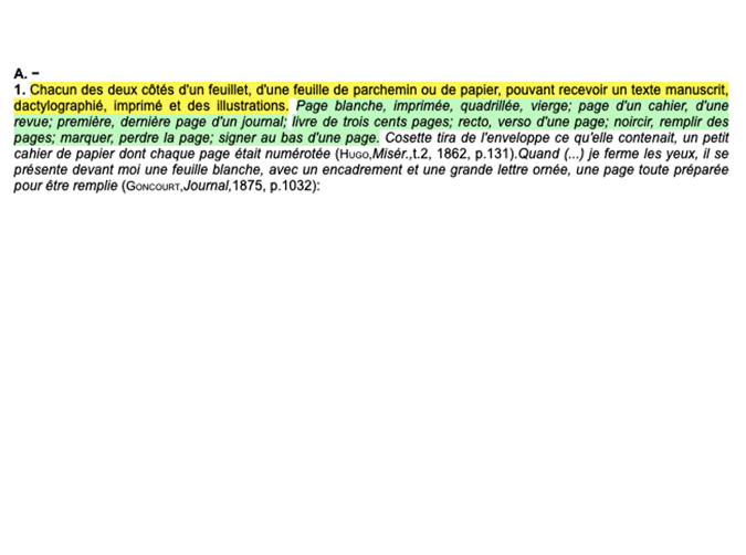 Pour la plupart des dictionnaires français, en 2021, c’est tout d’abord chacun des deux côtés d’un feuillet, ou d’une feuille, pouvant recevoir un texte et des illustrations