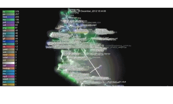 Visualisation du site develissimo.com avec les outils gource v0.37 & kdenlive. Extrait de "Software Development Visualization", vidéo disponible sur la chaîne Youtube Develissimo, 29 décembre 2012, ou même des "Nodes view" (vue des noeuds)