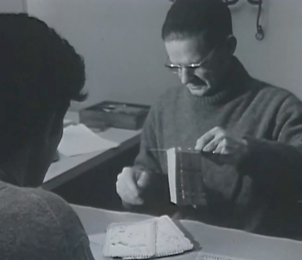 André Leroi-Gourhan sélectionnant les fiches mécanographiques. Capture d’écran à 12’30’’ de l’émission télévisée "Des bisons, des chevaux et des signes" de la série "Un certain regard", réalisée par Paul Seban, 19 avril 1970, Ina - Institut National de l’Audiovisuel. Entre 12’30’’ et 13’02’'' : suspendu dans la main d’André Leroi-Gourhan dans un reportage de 1970, un paquet de fiches perforées se balancent sur une tige métallique qui les relient… Ces fiches bibliographiques, bien que décrivant des écrits distincts, sont perforées selon des paramètres communs, et la tige les rassemble sous nos yeux en passant par ces trous.