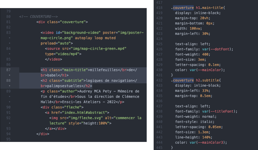 Capture d’écran du code source du présent site, à gauche le code HTML de la page d’accueil (index.html), à droite une portion du code CSS correspondant à cette zone. Le code CSS va ici attribuer à tout texte correspondant à ".couverture h1.main-title" – c’est à dire à l’intérieur de la division "couverture", taggé comme titre n°1 (h1), et dont la classe est "main-title" – une certaine disposition, police, couleur, taille, graisse, etc. Les deux fichiers sont donc fortement interreliés.