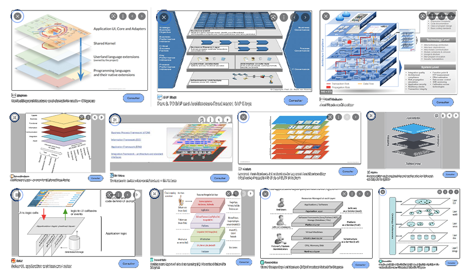Les représentations communes du numérique font la part belle à une structure en calques. Capture d’écran de 11 résultats de Google Image pour la requête "layered architecture code", décembre 2021 mais tout le principe du ”web” (littéralement “toile” en anglais)