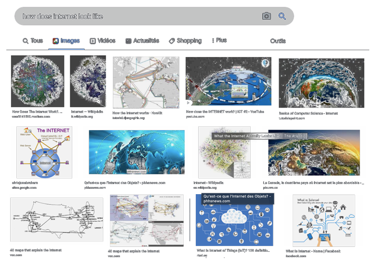 Les représentations communes du numérique font tout autant cas d’une structure en réseau. Capture d’écran de Google Image pour la requête "how does Internet look like" (à quoi ressemble Internet ?), décembre 2021 qui supporte le Web, est fondé sur la mise en réseau.