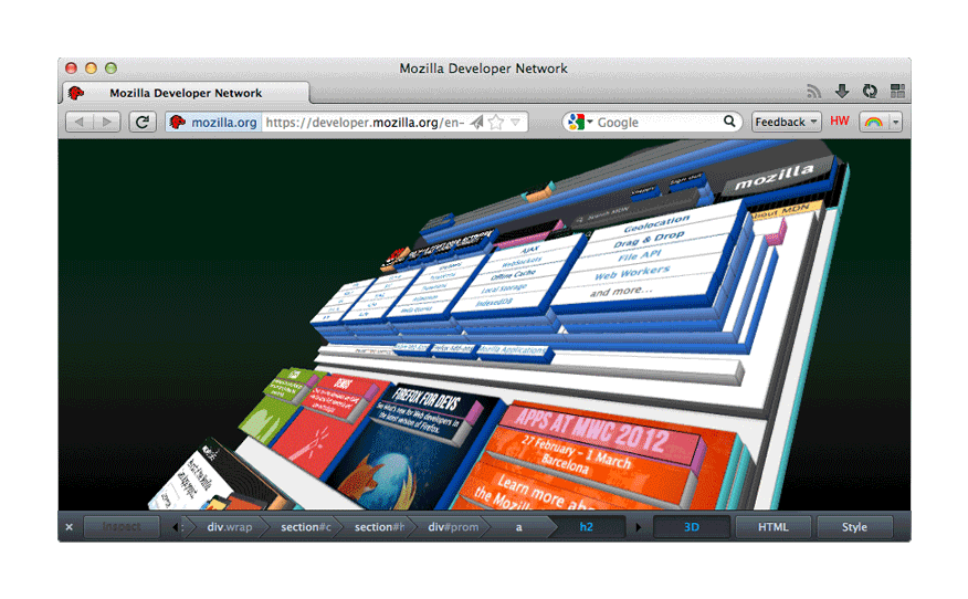 - Option de “vue 3D” proposée parmis les outils de développement du navigateur Mozilla Firefox 11. Cet outil n’est plus disponible depuis Mozilla Firefox 47. [en ligne]