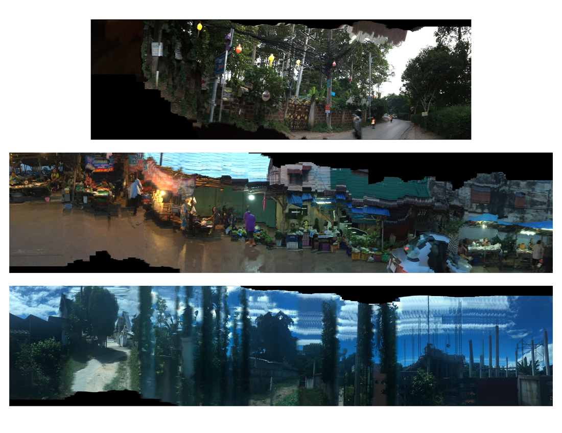 Une utilisation détournée de la fonction panorama des smartphones dévoile la technique de stitching à l’œuvre. En 2019, j’ai l’opportunité de voyager en Thaïlande. De nombreuses heures de bus, train, tuk tuk s’enchaînent : j’observe les paysages qui défilent, le nez collé à la vitre, tout comme mon portable que je trompe en créant des “panoramas” non pas par mouvement de rotation, mais de translation du transport, captant les visions disparaissantes du chemin. Le logiciel de stitching, perturbé, dévoile alors les bords des images qu’il tente comme il peut d’assembler.
