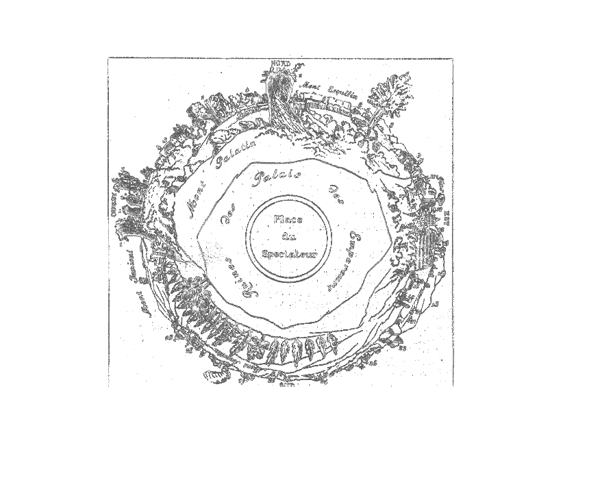 Le panorama de Rome (1820) tel qu’il figurait dans la notice explicative, d’après BAPST Germain, Essai sur l’histoire des panoramas et des dioramas, Paris, 1891. Illustration extraite de LAMBOLEY Claude, « Petite Histoire des Panoramas ou la fascination de l’illusion”, in Académie des Sciences et Lettres de Montpellier, Bulletin n°38, pp. 37-52 (édition 2008)