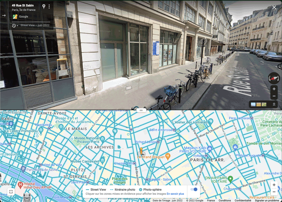 Avoir une image de satellite ne suffit pas, et Google l’a bien compris : avec ses Google Cars qui captent des séries de panoramas à 360°, il peut donner l’illusion d’avancer ou de reculer dans une rue, presque comme si on y était avec un champ de vision panoramique. Capture d’écran de l’interface de Google Maps avec l’option Google Street View pour le 48 rue Saint-Sabin à Paris, 2022.