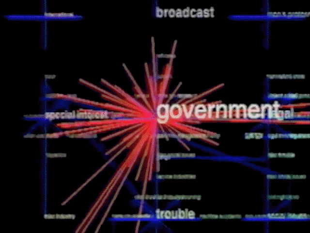 Personalized Galaxies of information : Interface d’exploration de mots-clés extraits et mis en relation par un algorithme à partir de titres d’articles de presse. Plusieurs couches représentent les différentes granularités de l’information, des mots-clés jusqu’aux détails des articles.© MIT Media Lab (Earl Rennison) Extrait de MAUDET Nolwenn , « Muriel Cooper : Informations Landscapes » article de la revue Back Office, vol. 1, février 2017, B42 et Fork Editions. [ en ligne ]