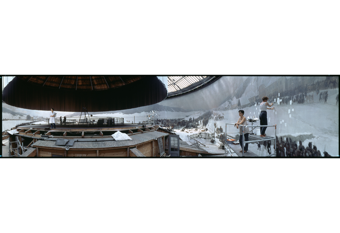 Jeff Wall, Restoration, 1993 © Jeff Wall. Panorama Bourbaki, 10 mètres de haut sur 35,6 mètres de diamètre (112 mètres de développement), conservée dans un musée consacré à Lucerne en Suisse, peinture cylindrique de Édouard Castres. Il représente avec réalisme un épisode de la guerre franco-prussienne de 1870-1871 : la débâcle de l’armée Bourbaki de janvier 1871.