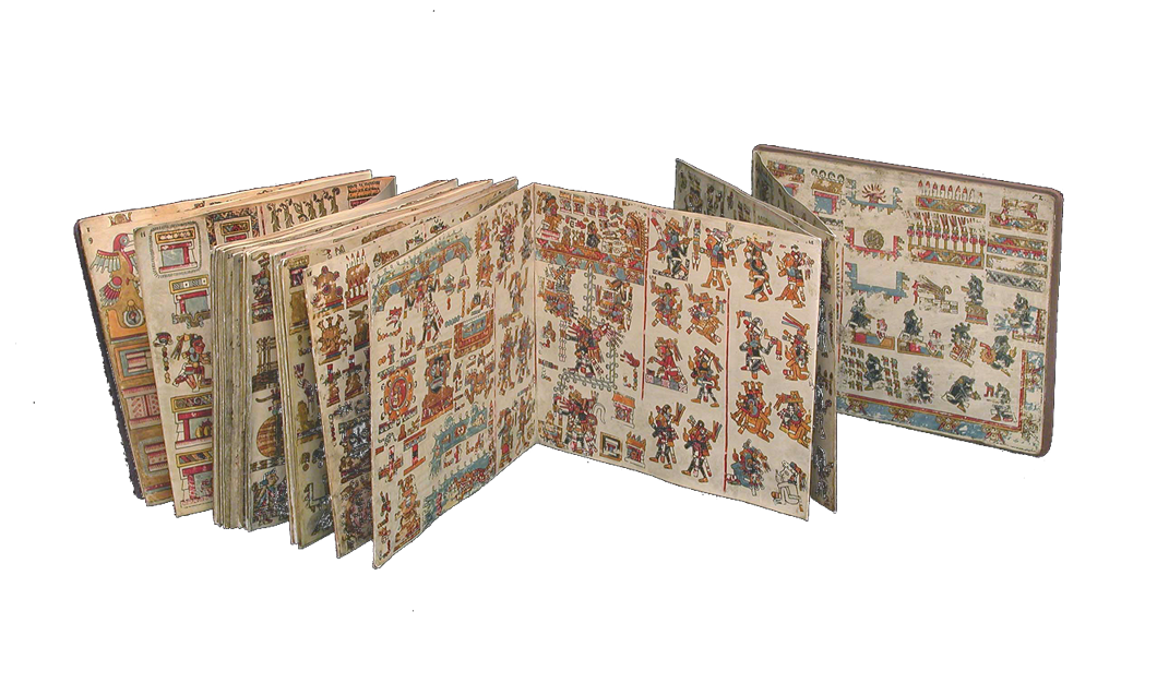 Codex Zouche-Nuttall, Mexique central, découvert au couvent de San Marco à Florence en 1854, British Museum. Manuscrit en peau animale, composé de 47 feuilles, pliées en accordéon. Les images se « lisent » en boustrophédon, des lignes rouges servant de repères. Le codex est peint au recto et au verso. Les images du recto racontent sur plusieurs siècles une histoire générale mixtèque depuis le premier couple mythique issu de deux arbres à un endroit appelé Apoala. Le verso est consacré à la généalogie, aux alliances et aux conquêtes d’un célèbre seigneur mixtèque appelé « Huit-Cerf Griffe d’Ocelot » de Tilantongo, une petite cité mixtèque de l’Oaxaca, au 11e siècle.