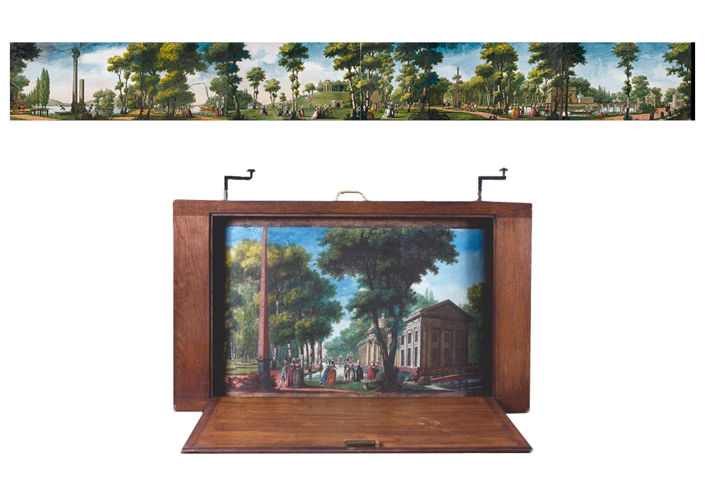 Transparents de Carmontelle, vers 1780, Louis Carrogis dit Carmontelle, entre 25 m et 55 m. “Carmontelle actionne lui-même les manivelles qui permettent de dérouler les mètres de transparents où sont peintes les différentes scènes ; il donne vie aux personnages par des changements de voix et raconte son histoire par un défilement sans temps morts.“