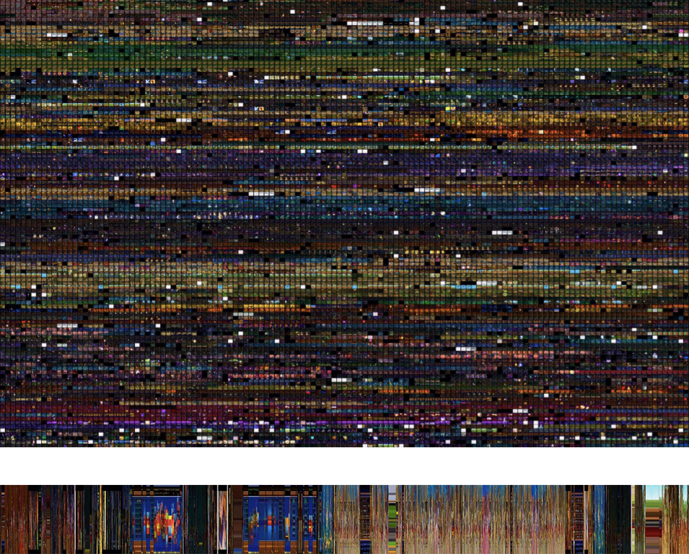 The video captured from all game sessions of each game were assembled into a singe sequence. The sequences were sampled at 6 frames per second. This resulted in 225,000 frames for Kingdom Hearts and 133,000 frames for Kingdom Hearts II. The visualizations use only every 10th frame from the complete frame sets.” (bas) “A segment from a visualization of the sequence of gameplay sessions ; this segment represents 2.34 hours of gameplay sampled at 1 frames every 2 seconds (30 per minute). Each vertical line corresponds to one frame, for a total of 4227 frames.”